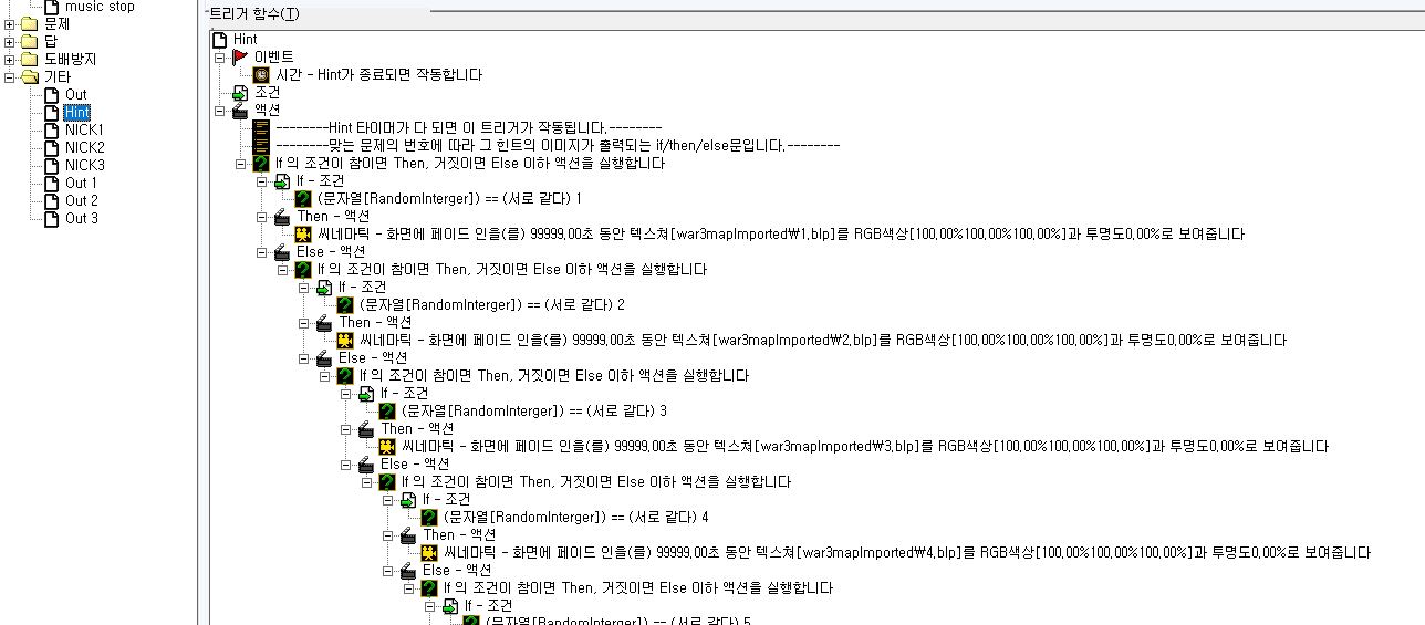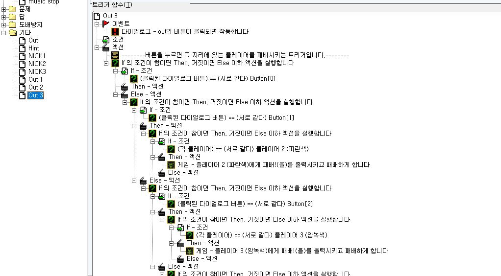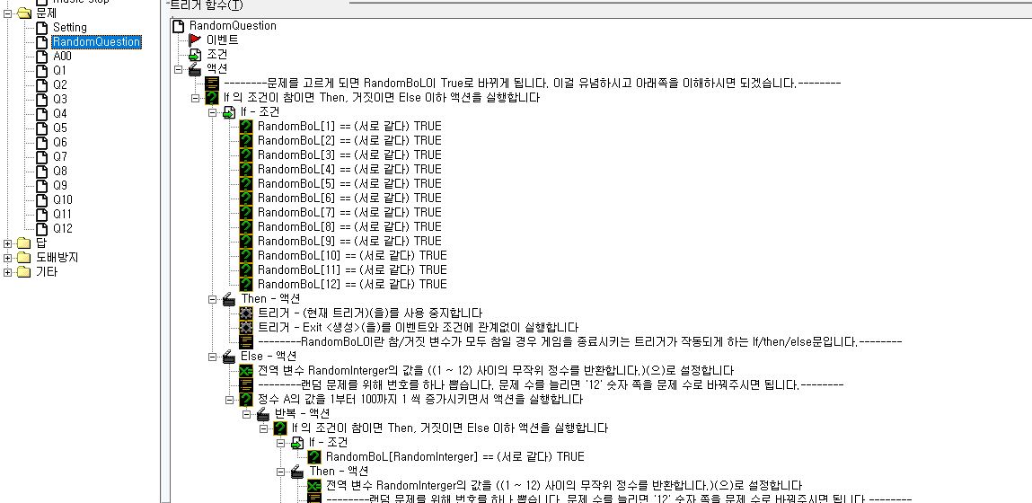 열쇠(답)이 저 조건과 일치하면 문이 열리게 (트리거)작동이 되고 아래 있는 액션들이 작동이 됩니다.